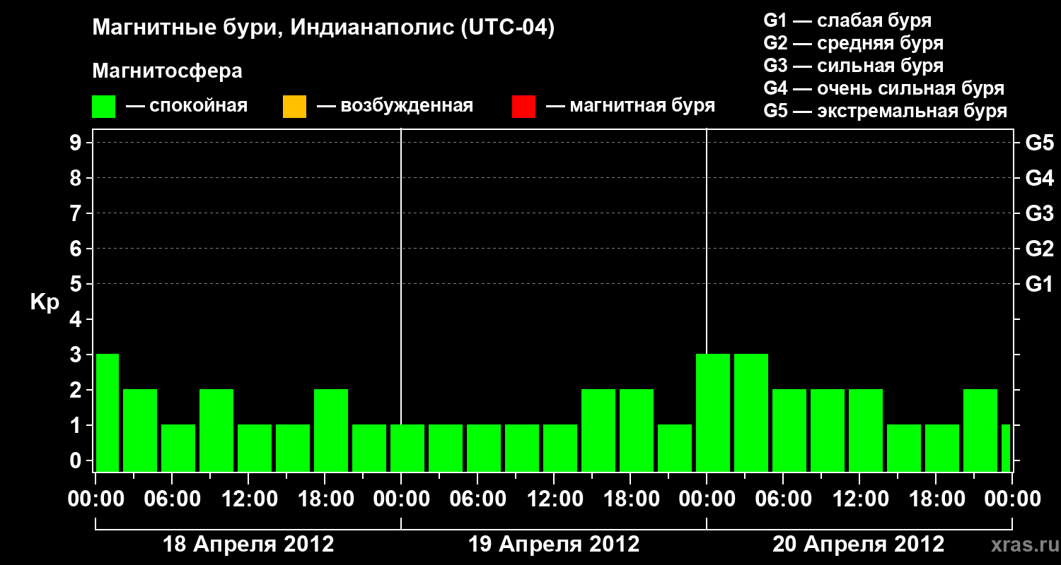 Изменения геомагнитного индекса Kp с 18 по 20 апреля 2012 года для средних широт