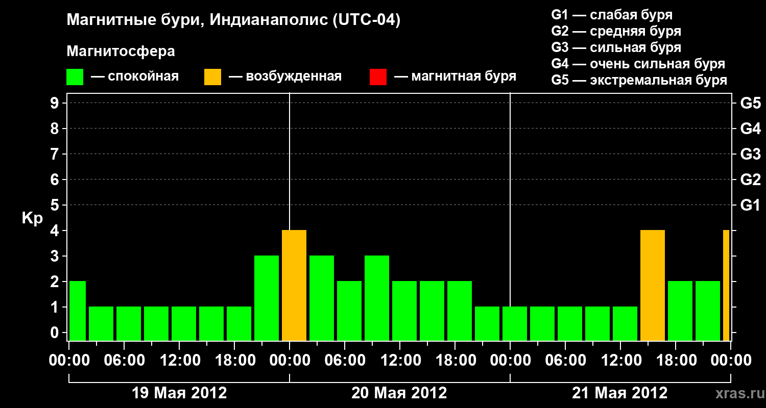 Изменения геомагнитного индекса Kp с 19 по 21 мая 2012 года для средних широт