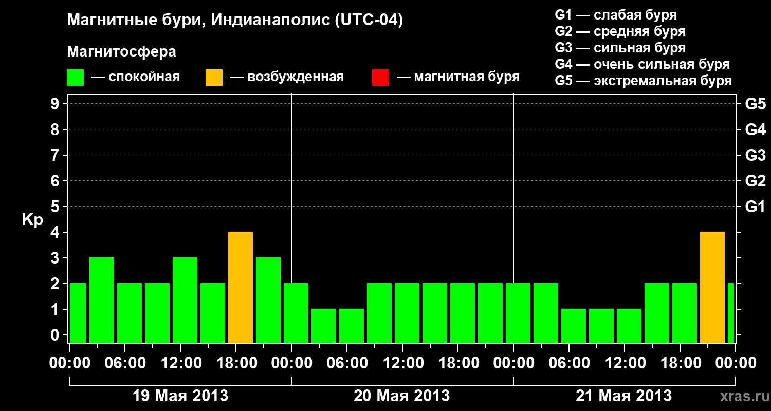 Изменения геомагнитного индекса Kp с 19 по 21 мая 2013 года для средних широт