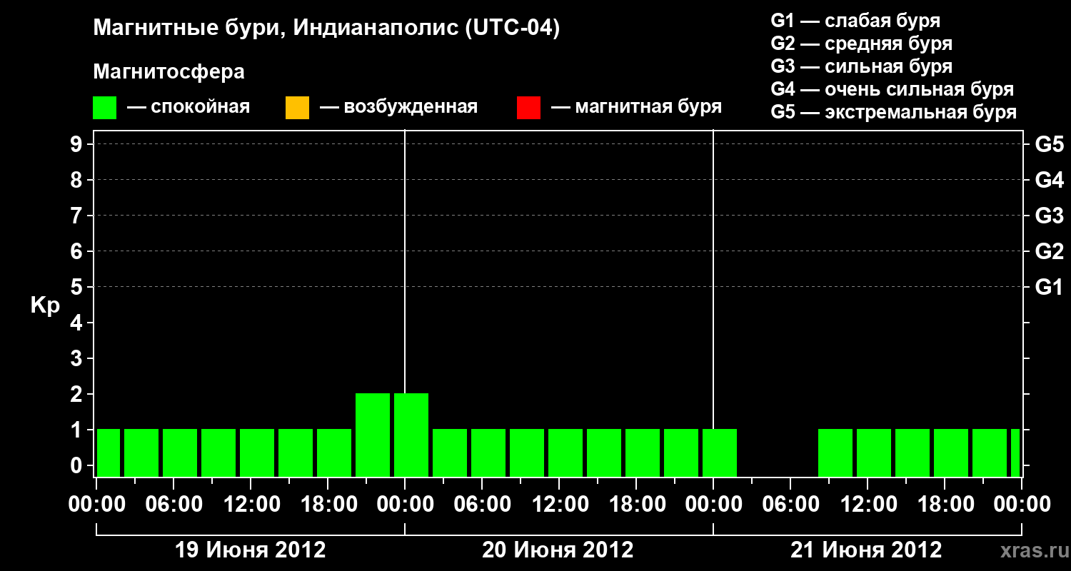 Изменения геомагнитного индекса Kp с 19 по 21 июня 2012 года для средних широт