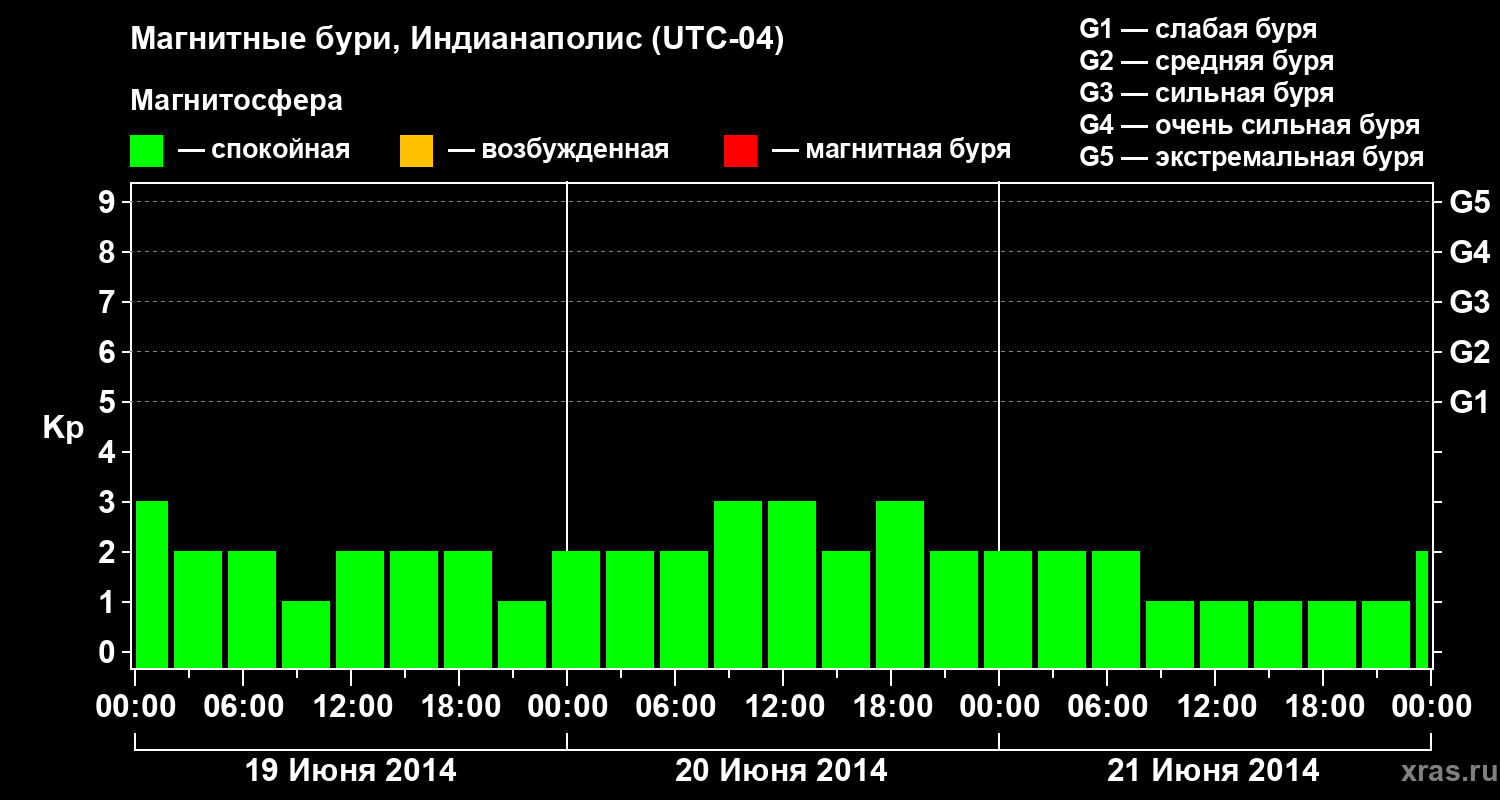 Изменения геомагнитного индекса Kp с 19 по 21 июня 2014 года для средних широт