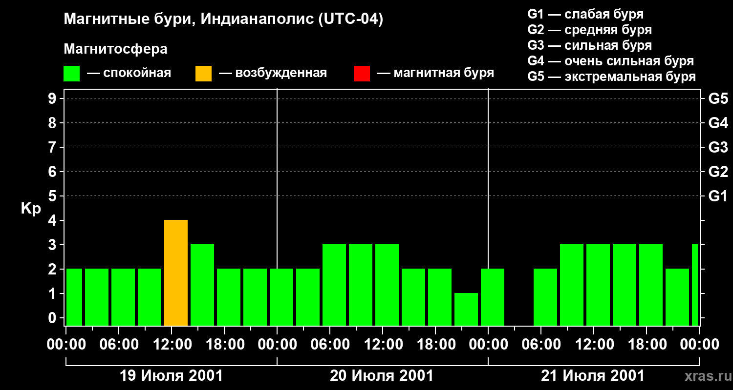 Изменения геомагнитного индекса Kp с 19 по 21 июля 2001 года для средних широт