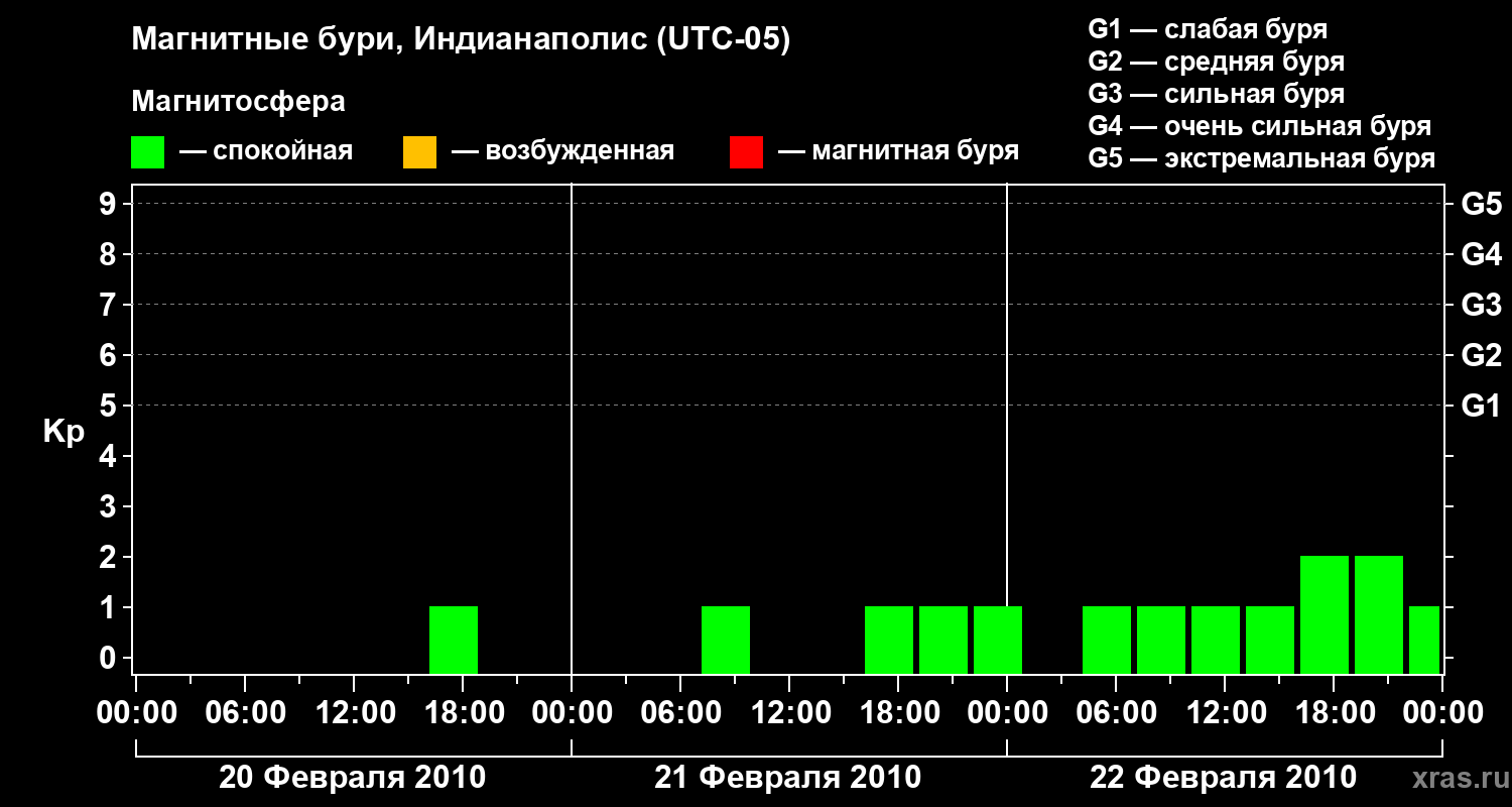 Изменения геомагнитного индекса Kp с 20 по 22 февраля 2010 года для средних широт