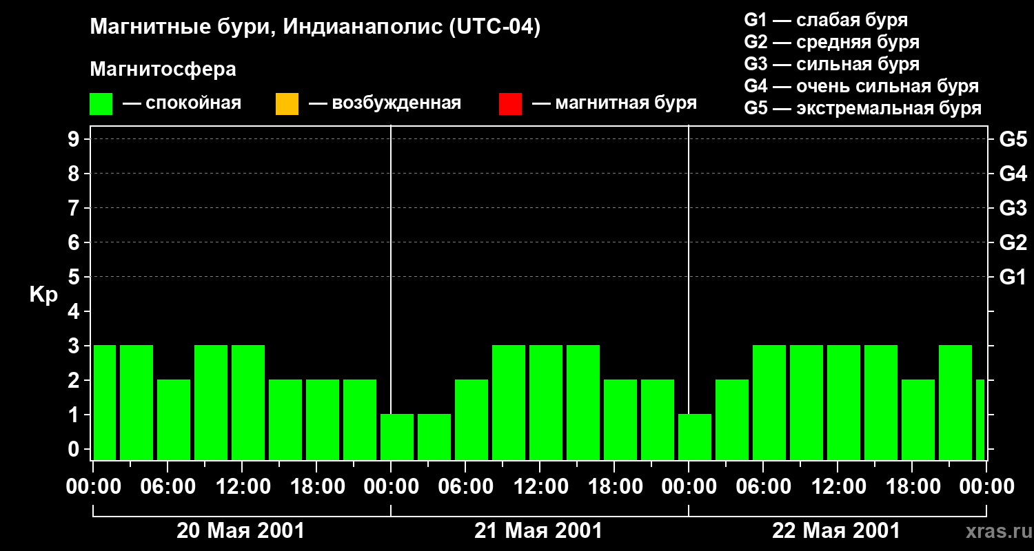 Изменения геомагнитного индекса Kp с 20 по 22 мая 2001 года для средних широт