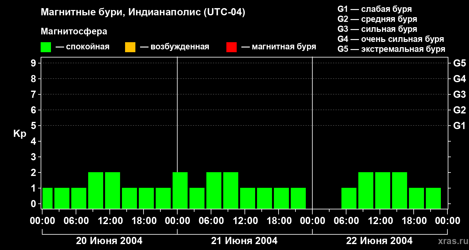 Изменения геомагнитного индекса Kp с 20 по 22 июня 2004 года для средних широт