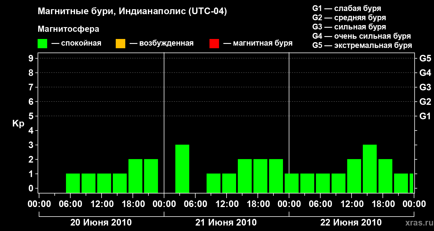 Изменения геомагнитного индекса Kp с 20 по 22 июня 2010 года для средних широт
