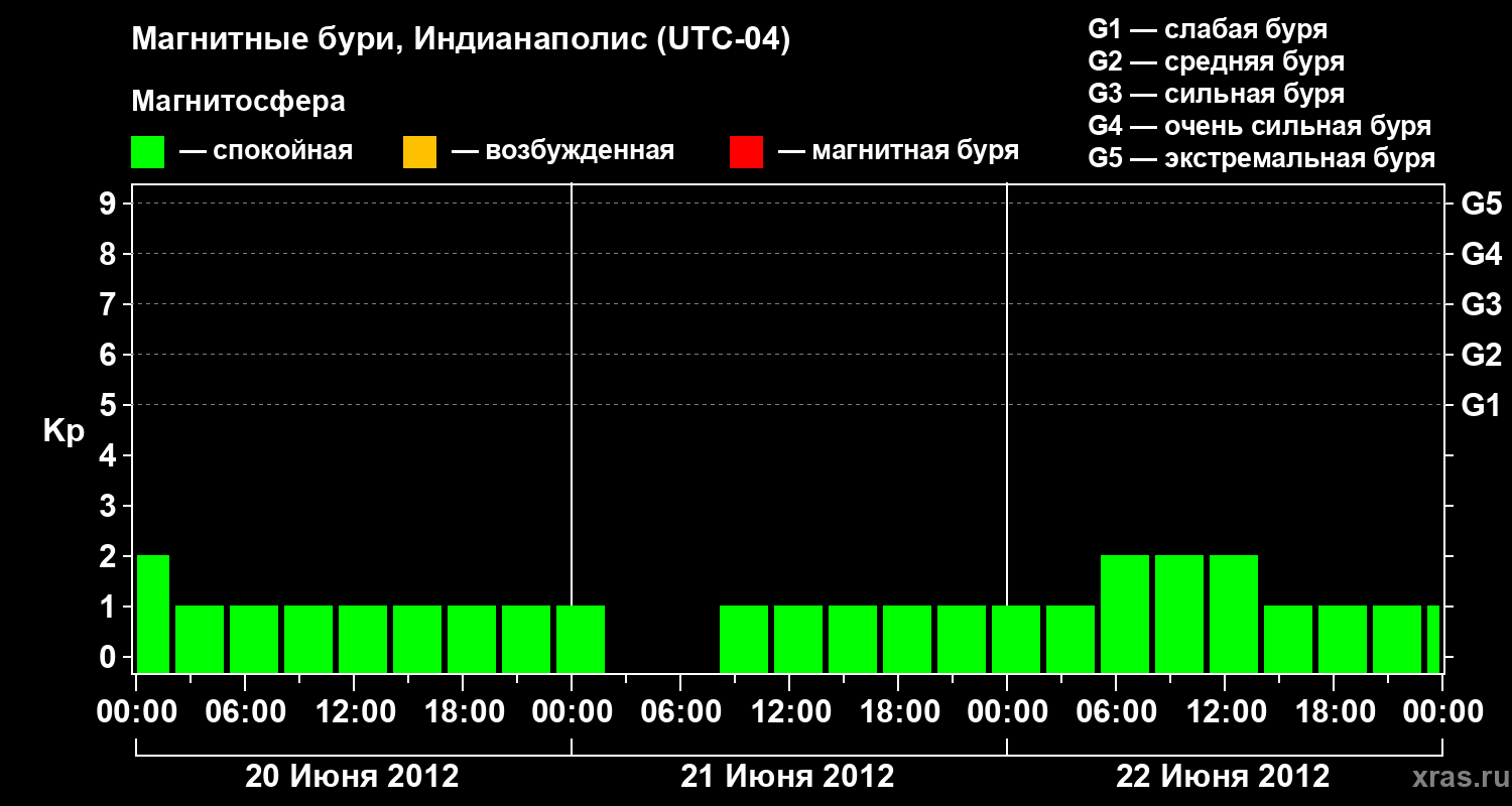 Изменения геомагнитного индекса Kp с 20 по 22 июня 2012 года для средних широт
