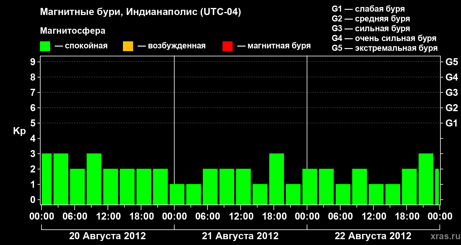 Изменения геомагнитного индекса Kp с 20 по 22 августа 2012 года для средних широт