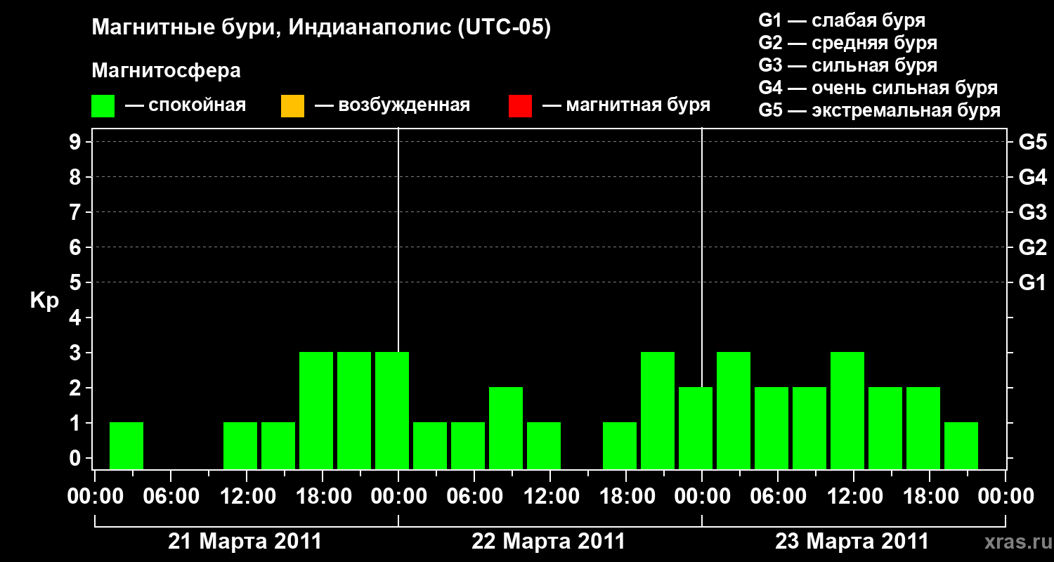 Изменения геомагнитного индекса Kp с 21 по 23 марта 2011 года для средних широт