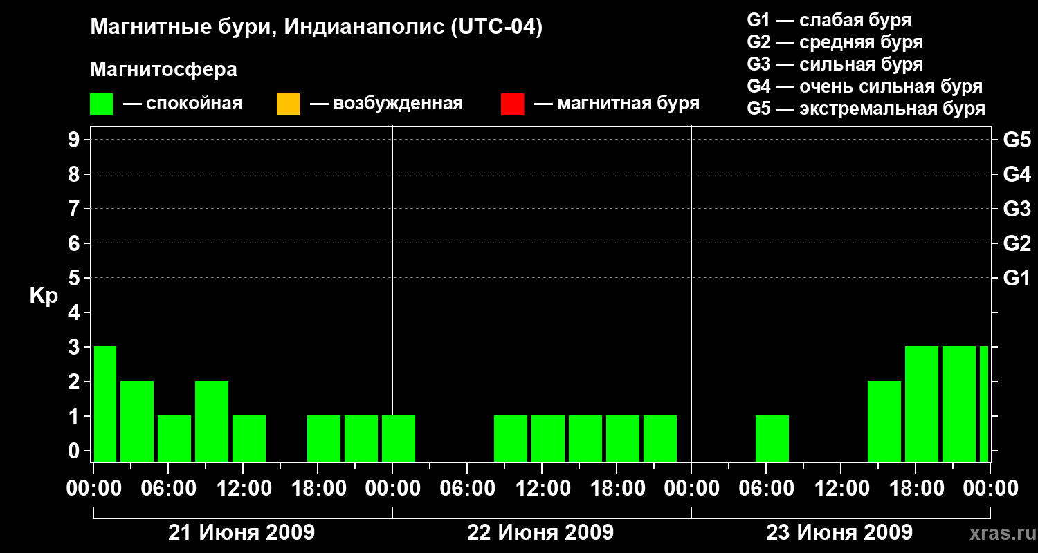 Изменения геомагнитного индекса Kp с 21 по 23 июня 2009 года для средних широт