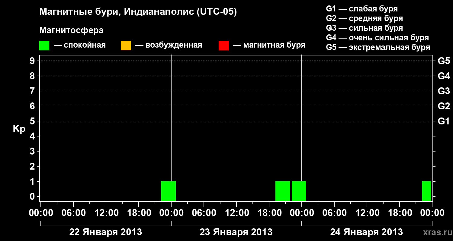 Изменения геомагнитного индекса Kp с 22 по 24 января 2013 года для средних широт