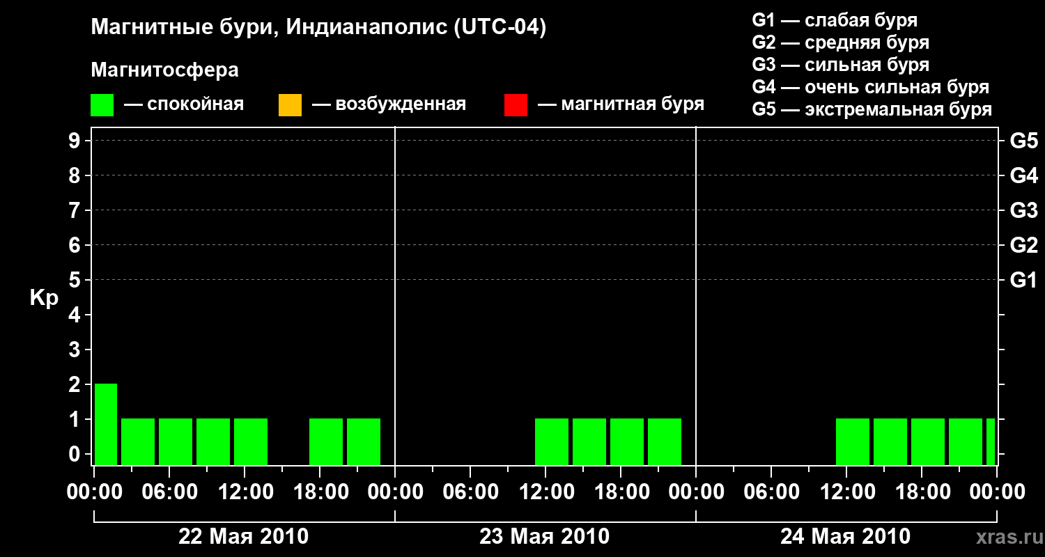 Изменения геомагнитного индекса Kp с 22 по 24 мая 2010 года для средних широт