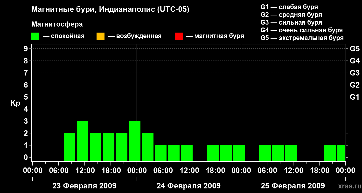 Изменения геомагнитного индекса Kp с 23 по 25 февраля 2009 года для средних широт