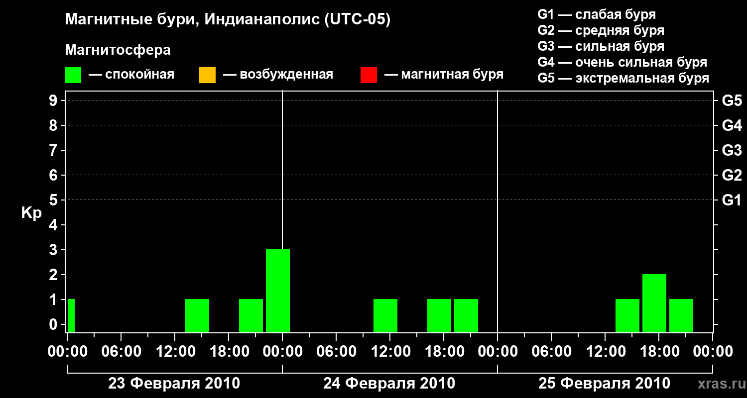 Изменения геомагнитного индекса Kp с 23 по 25 февраля 2010 года для средних широт