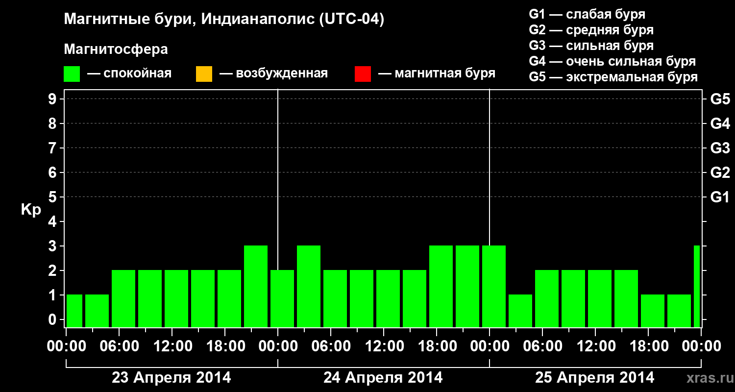 Изменения геомагнитного индекса Kp с 23 по 25 апреля 2014 года для средних широт