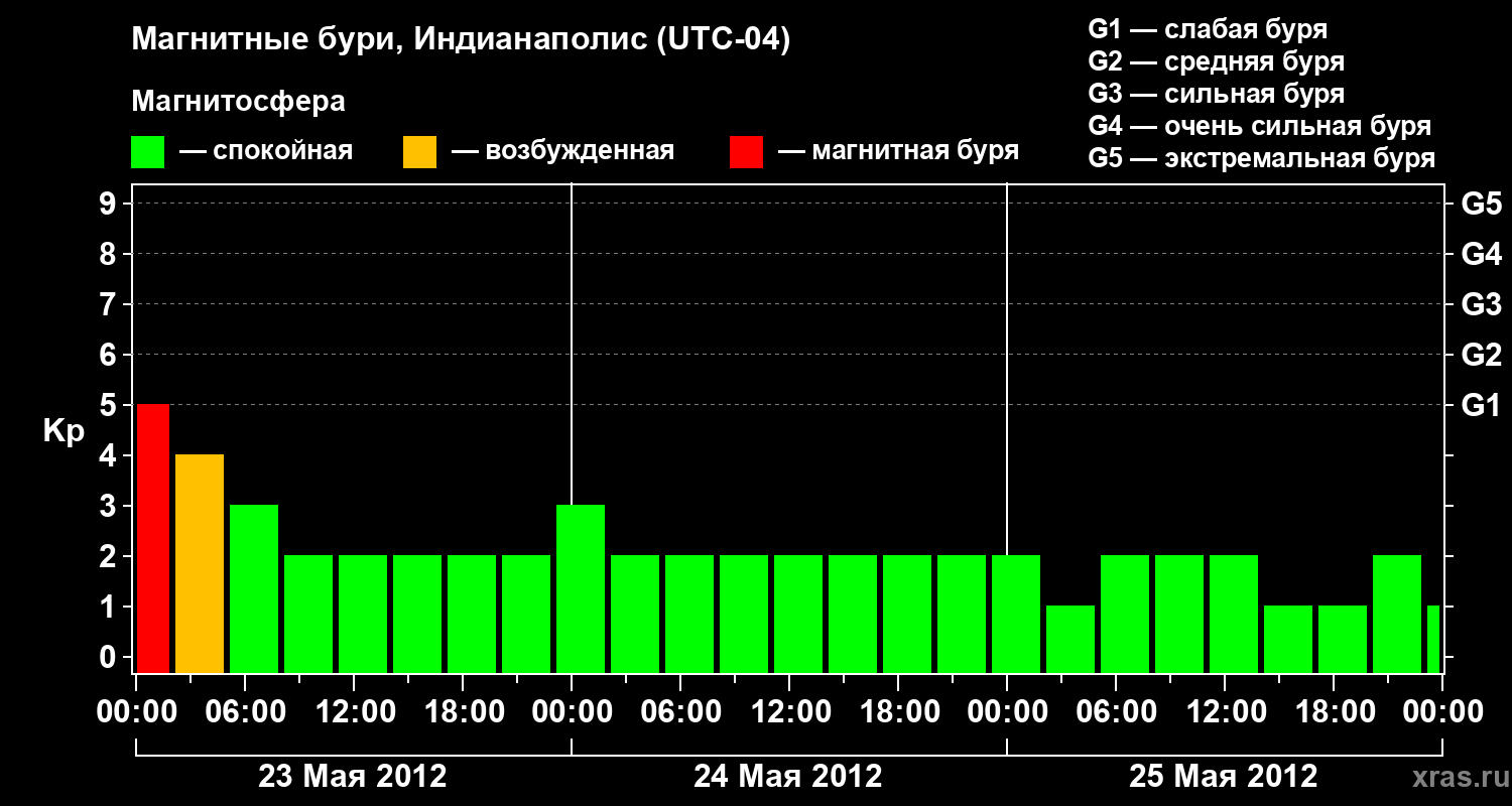 Изменения геомагнитного индекса Kp с 23 по 25 мая 2012 года для средних широт