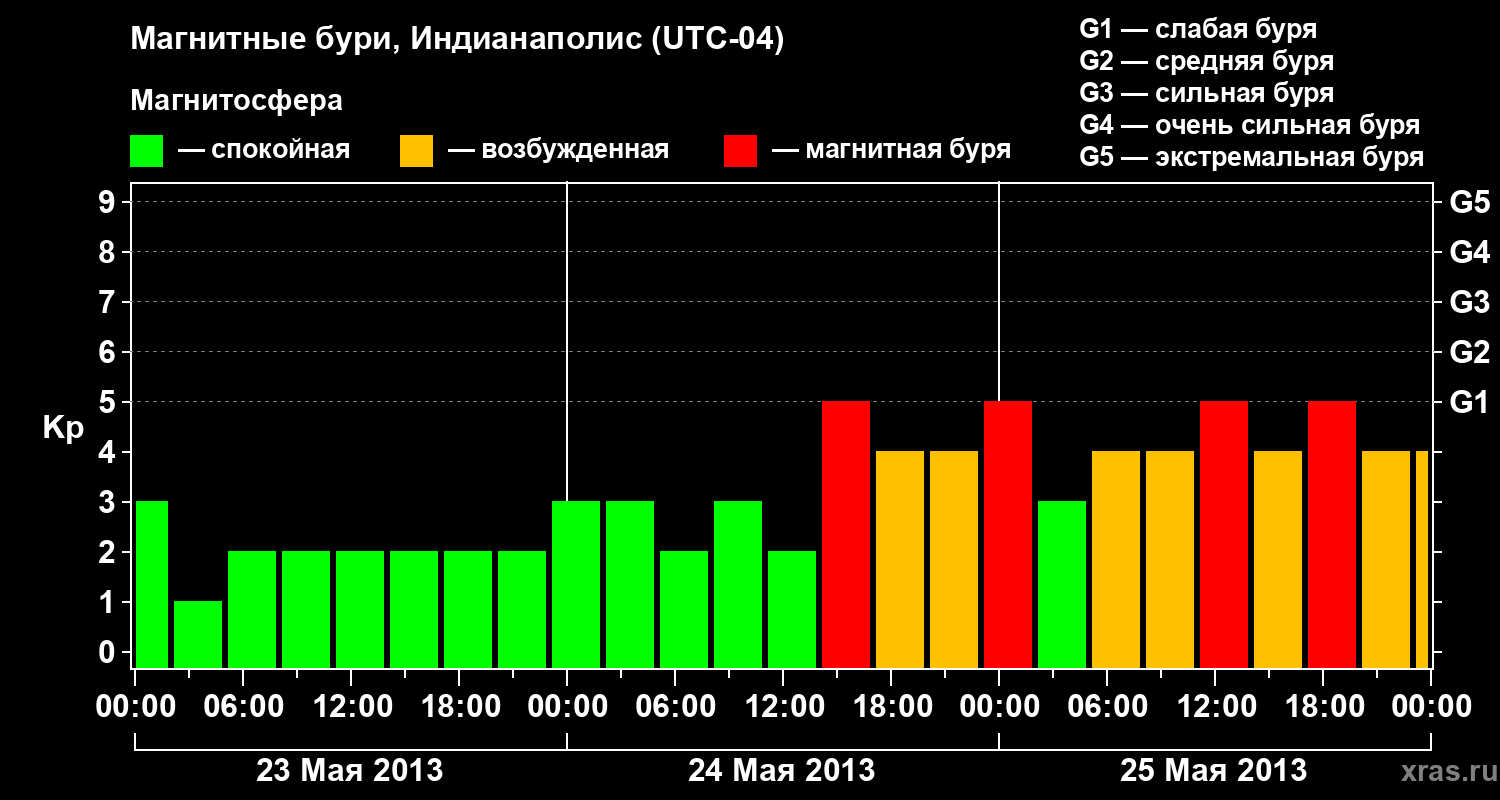 Изменения геомагнитного индекса Kp с 23 по 25 мая 2013 года для средних широт