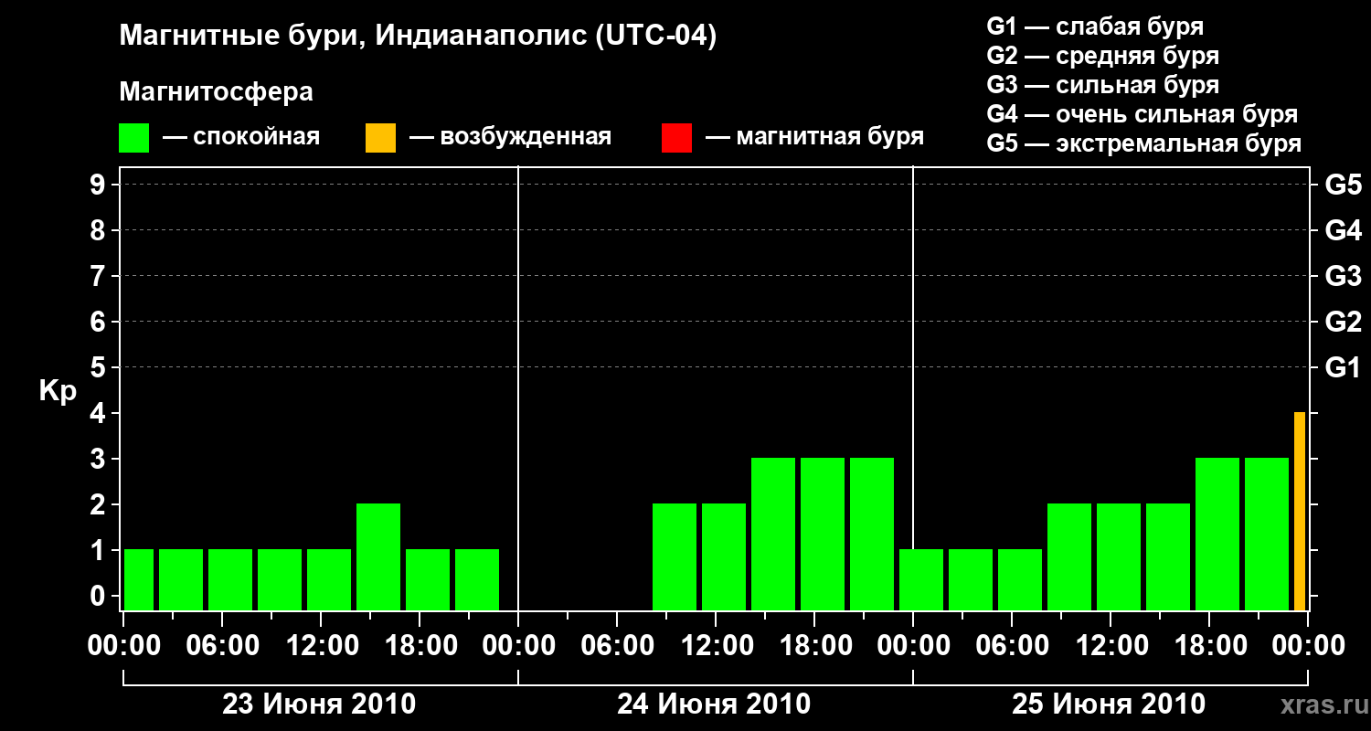 Изменения геомагнитного индекса Kp с 23 по 25 июня 2010 года для средних широт