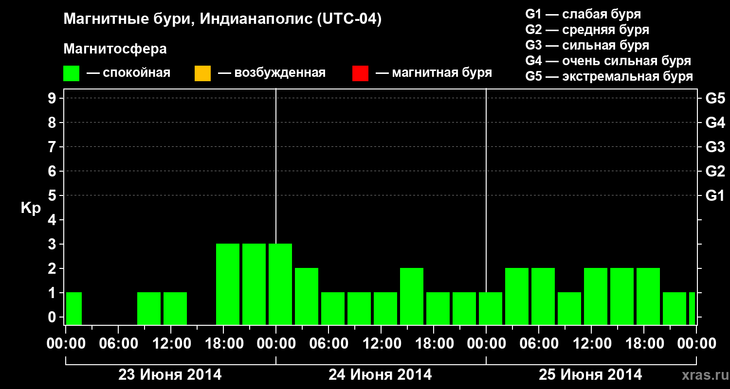 Изменения геомагнитного индекса Kp с 23 по 25 июня 2014 года для средних широт