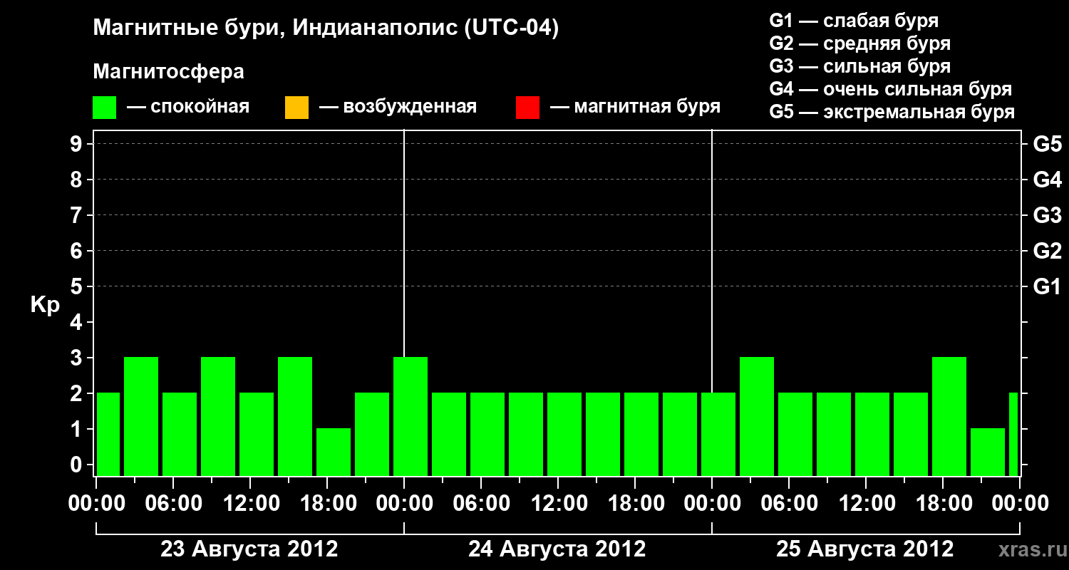 Изменения геомагнитного индекса Kp с 23 по 25 августа 2012 года для средних широт