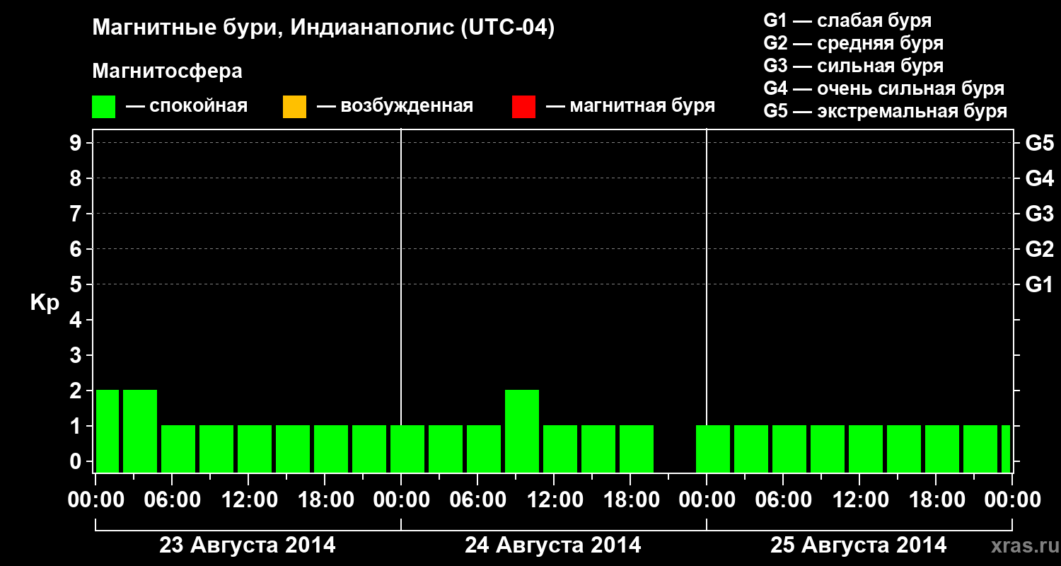 Изменения геомагнитного индекса Kp с 23 по 25 августа 2014 года для средних широт