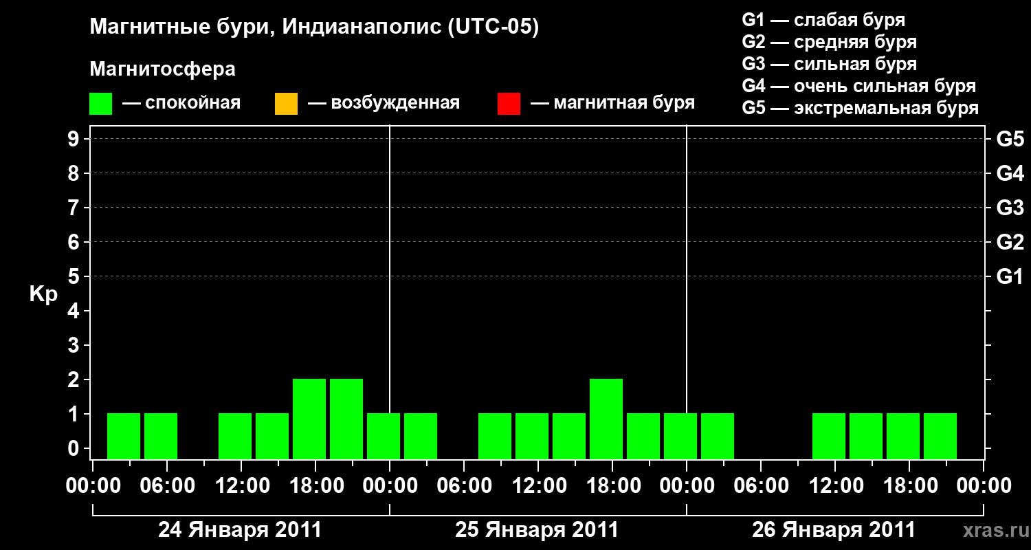 Изменения геомагнитного индекса Kp с 24 по 26 января 2011 года для средних широт