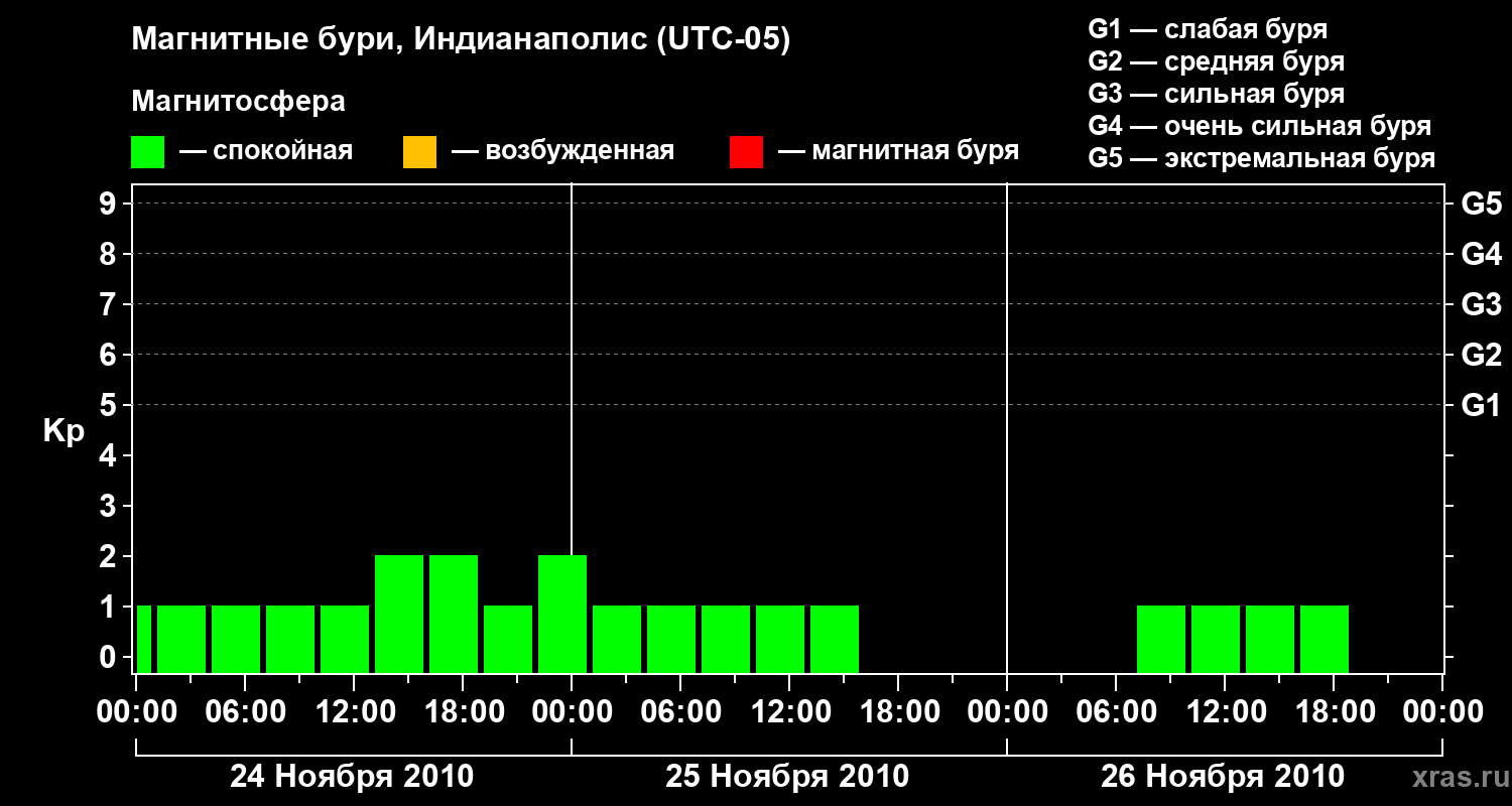 Изменения геомагнитного индекса Kp с 24 по 26 ноября 2010 года для средних широт