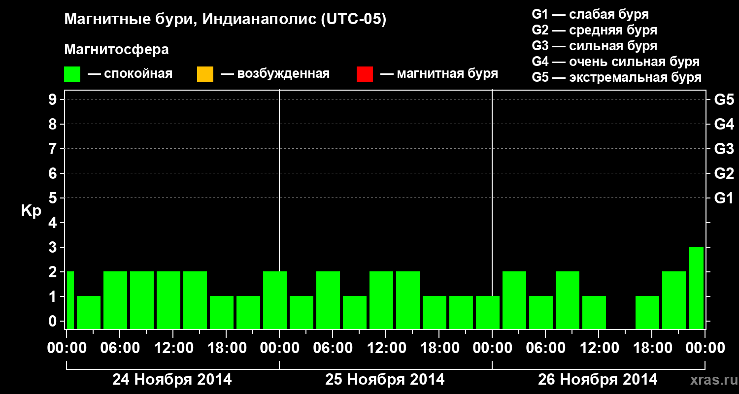 Изменения геомагнитного индекса Kp с 24 по 26 ноября 2014 года для средних широт