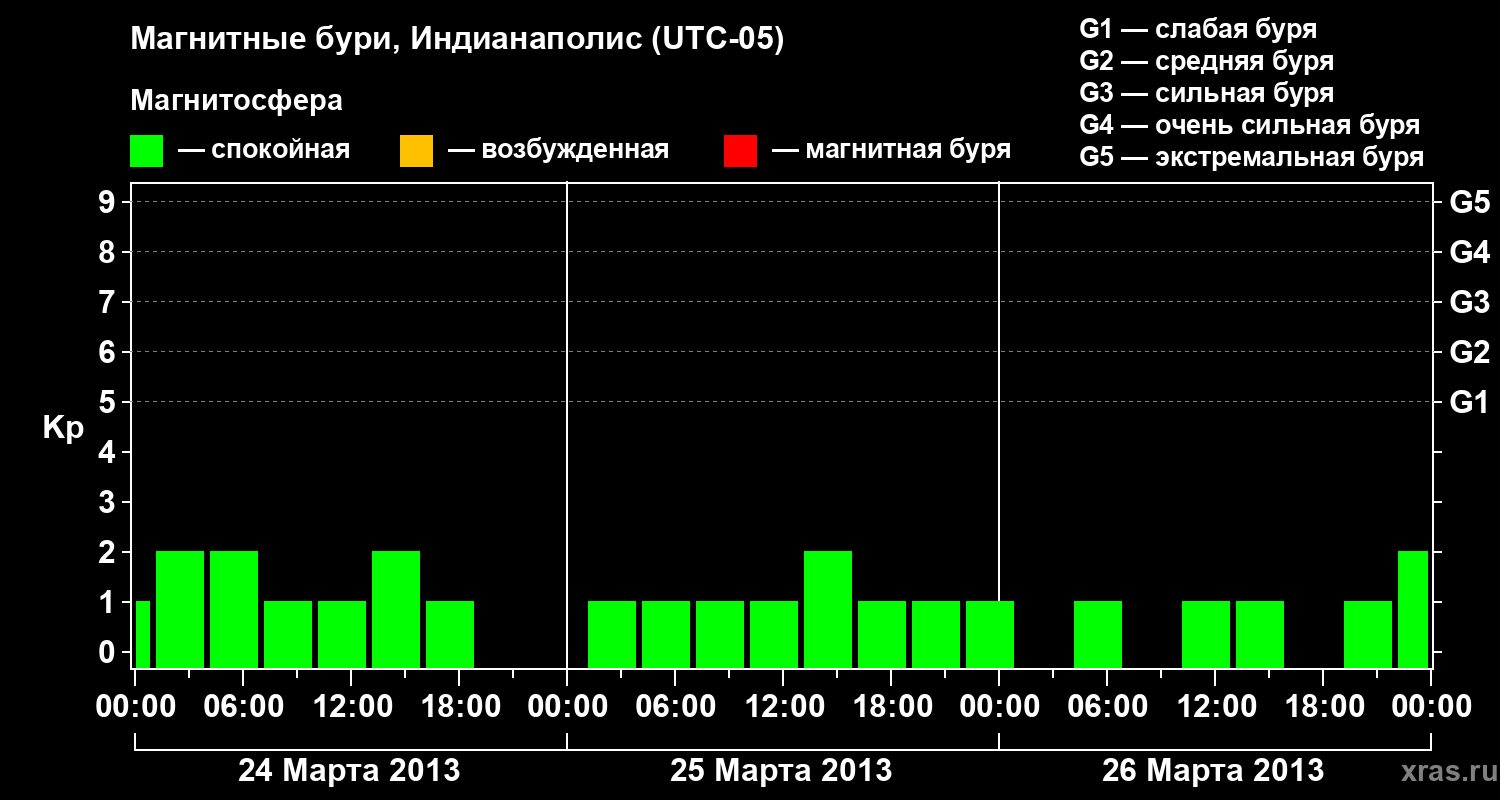 Изменения геомагнитного индекса Kp с 24 по 26 марта 2013 года для средних широт