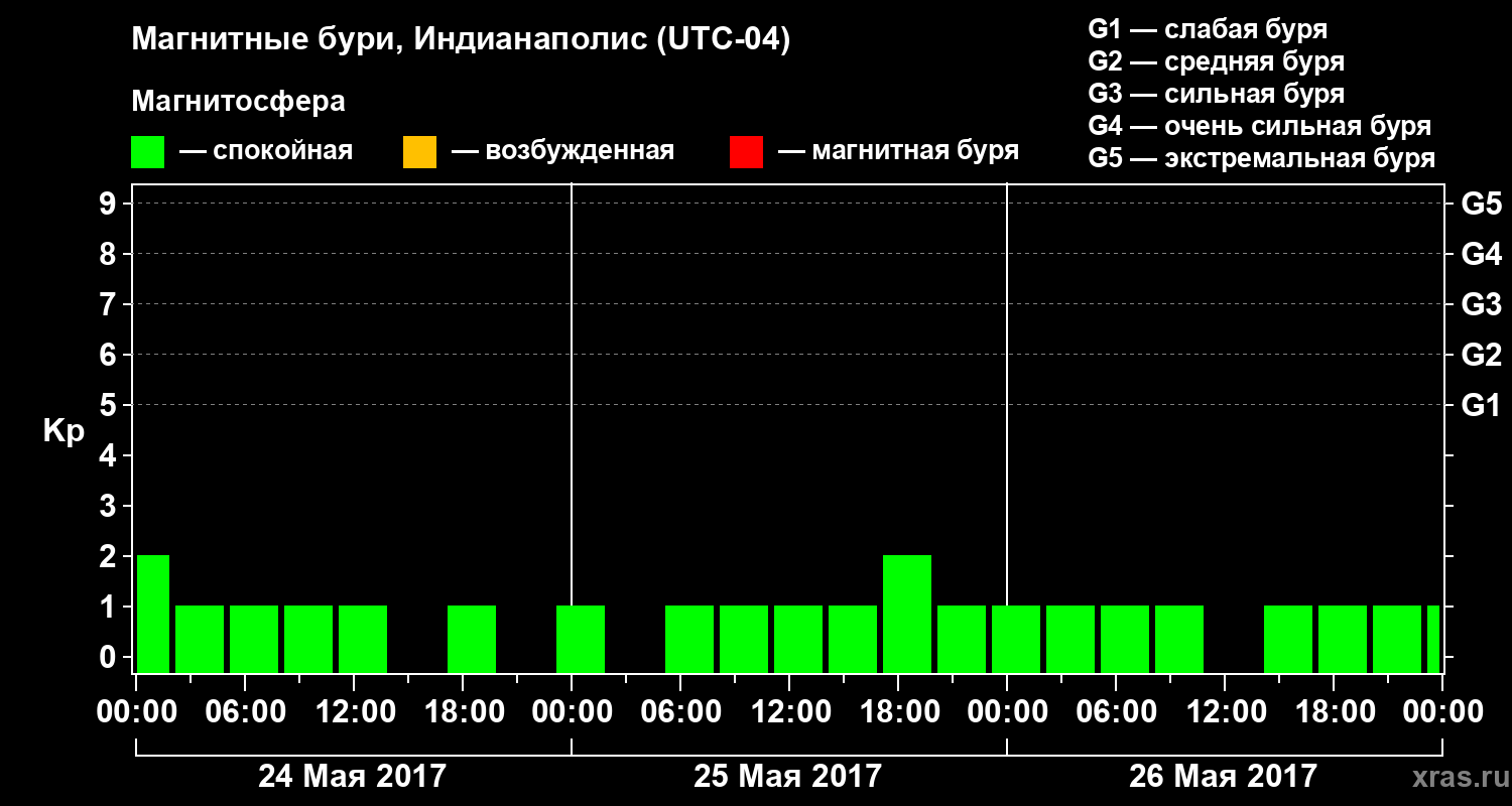 Изменения геомагнитного индекса Kp с 24 по 26 мая 2017 года для средних широт