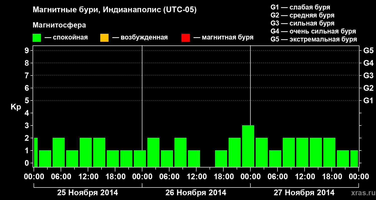 Изменения геомагнитного индекса Kp с 25 по 27 ноября 2014 года для средних широт