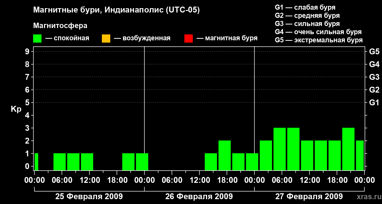 Изменения геомагнитного индекса Kp с 25 по 27 февраля 2009 года для средних широт