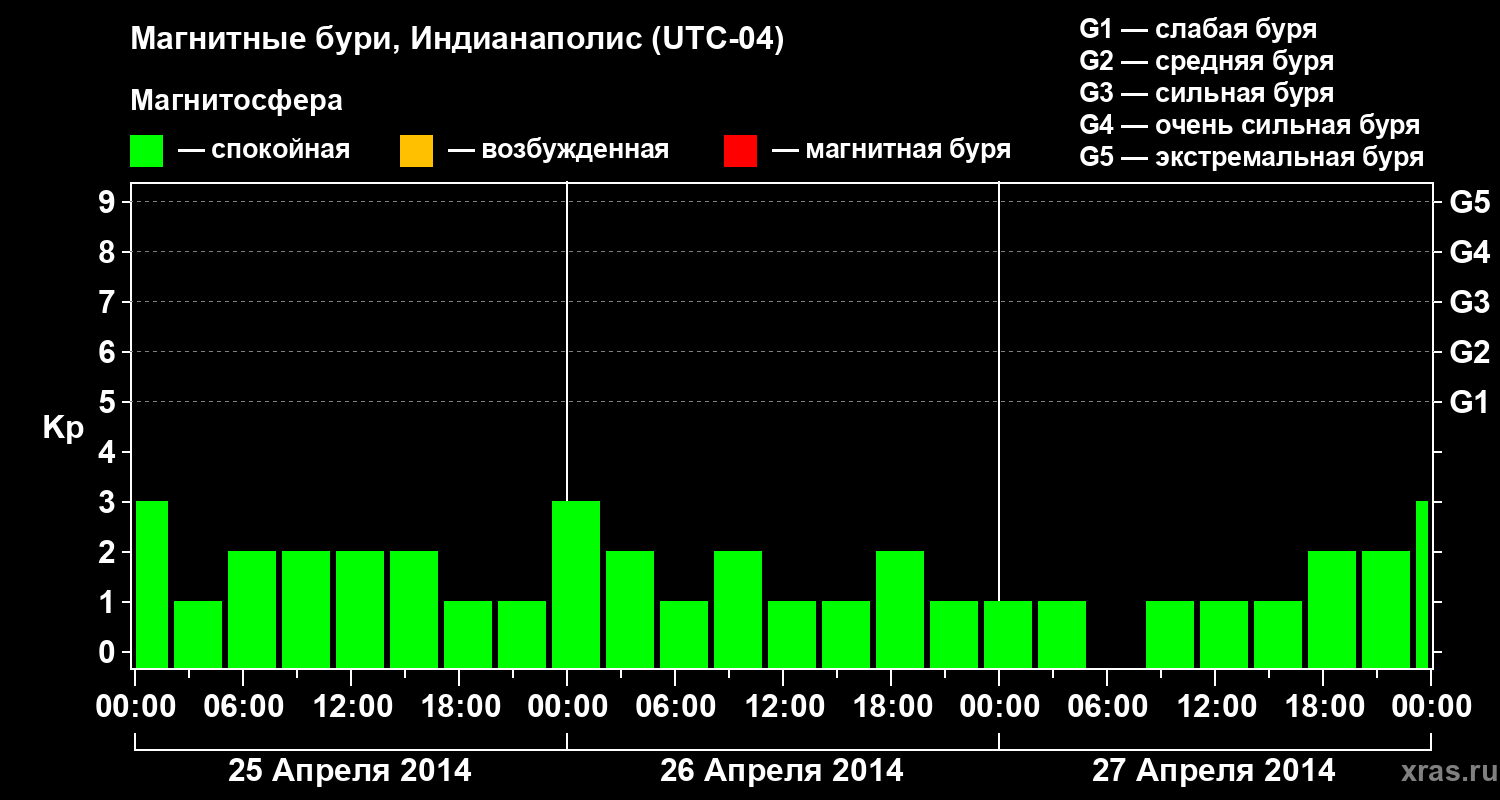 Изменения геомагнитного индекса Kp с 25 по 27 апреля 2014 года для средних широт