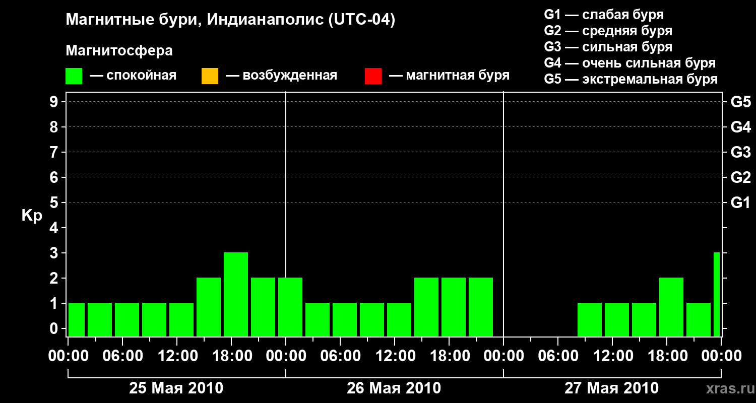 Изменения геомагнитного индекса Kp с 25 по 27 мая 2010 года для средних широт
