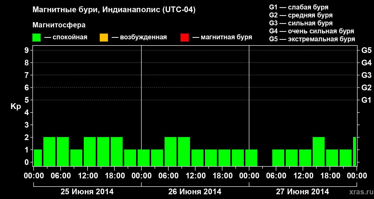 Изменения геомагнитного индекса Kp с 25 по 27 июня 2014 года для средних широт