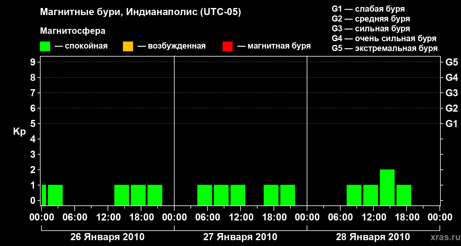 Изменения геомагнитного индекса Kp с 26 по 28 января 2010 года для средних широт