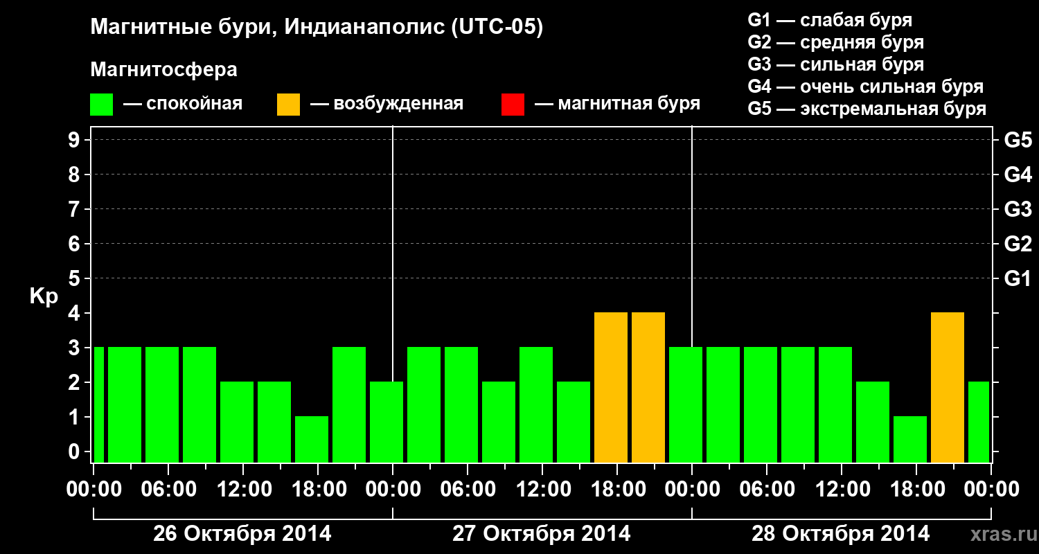 Изменения геомагнитного индекса Kp с 26 по 28 октября 2014 года для средних широт