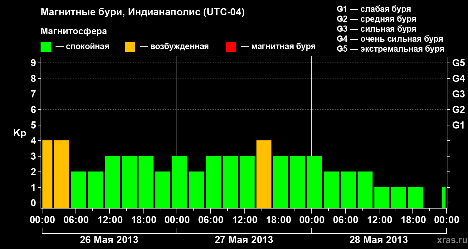 Изменения геомагнитного индекса Kp с 26 по 28 мая 2013 года для средних широт