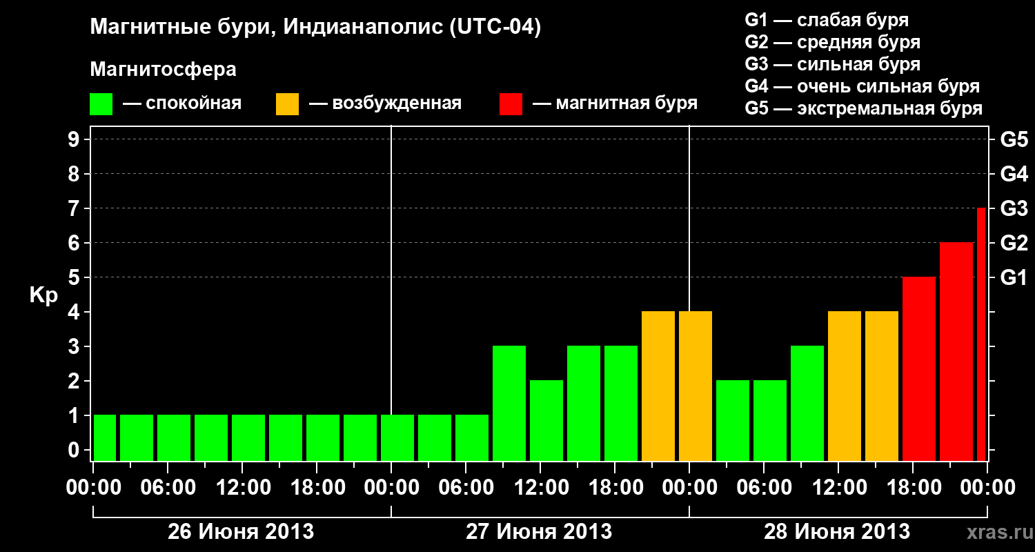 Изменения геомагнитного индекса Kp с 26 по 28 июня 2013 года для средних широт