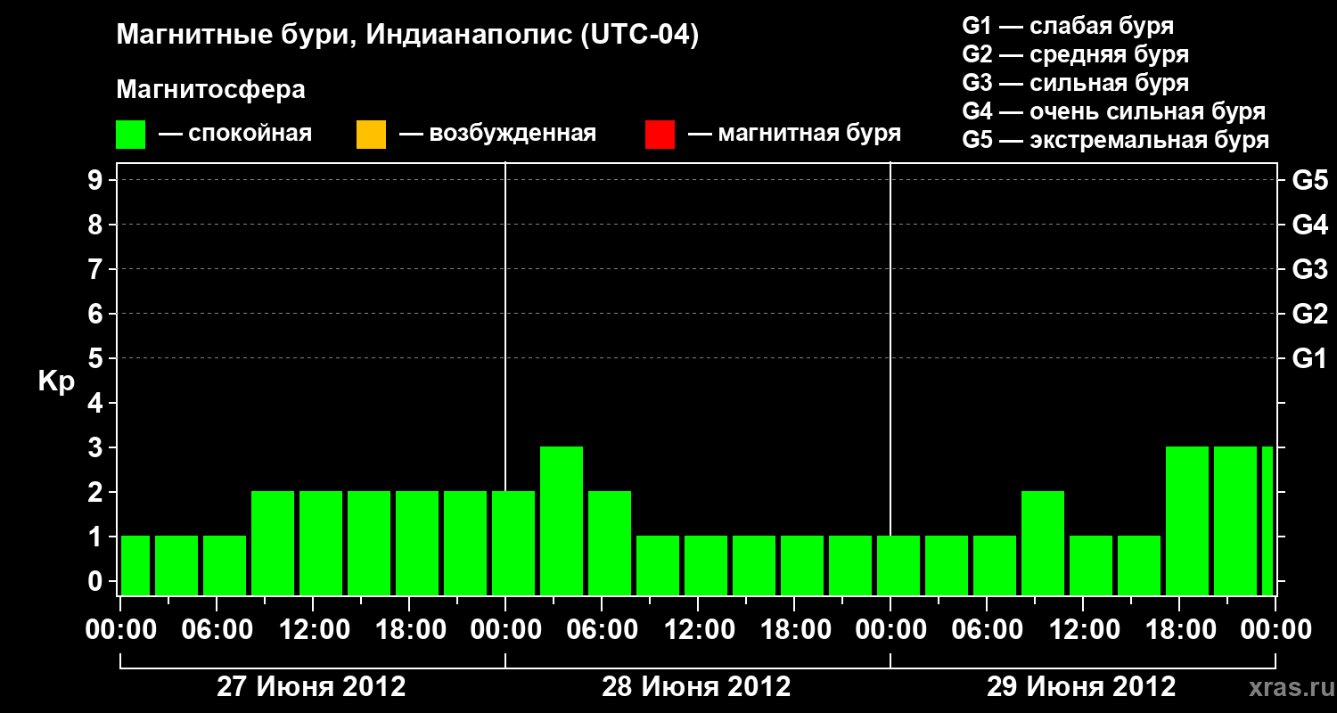 Изменения геомагнитного индекса Kp с 27 по 29 июня 2012 года для средних широт