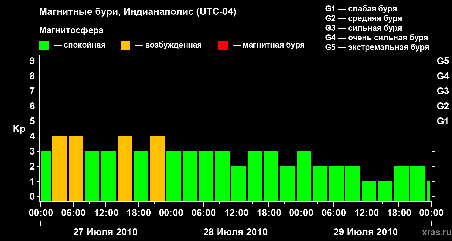 Изменения геомагнитного индекса Kp с 27 по 29 июля 2010 года для средних широт