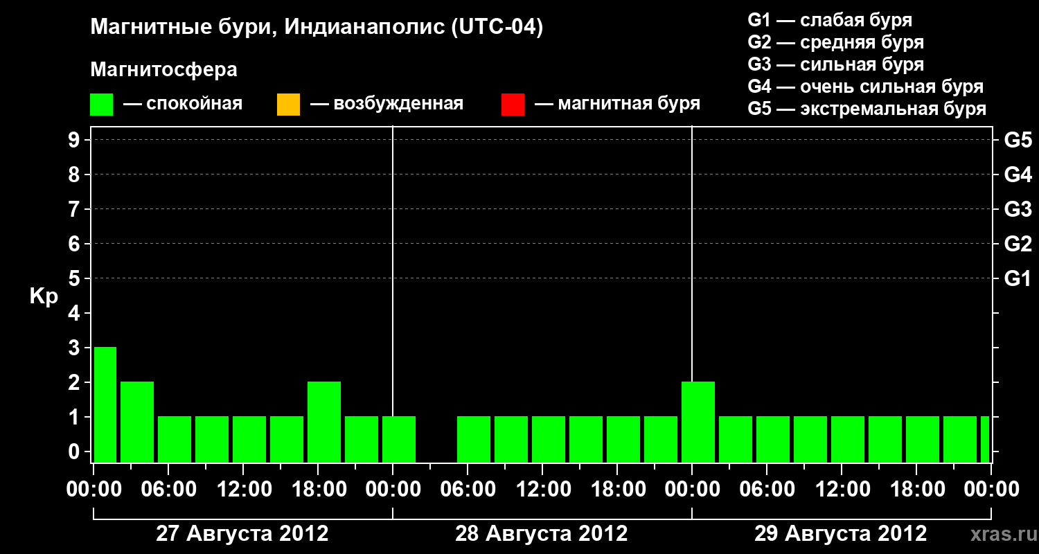 Изменения геомагнитного индекса Kp с 27 по 29 августа 2012 года для средних широт