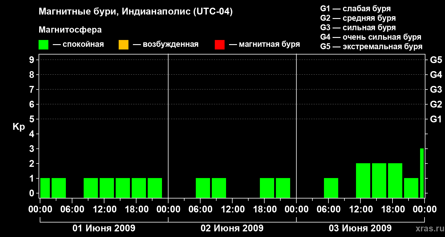 Изменения геомагнитного индекса Kp с 1 по 3 июня 2009 года для средних широт