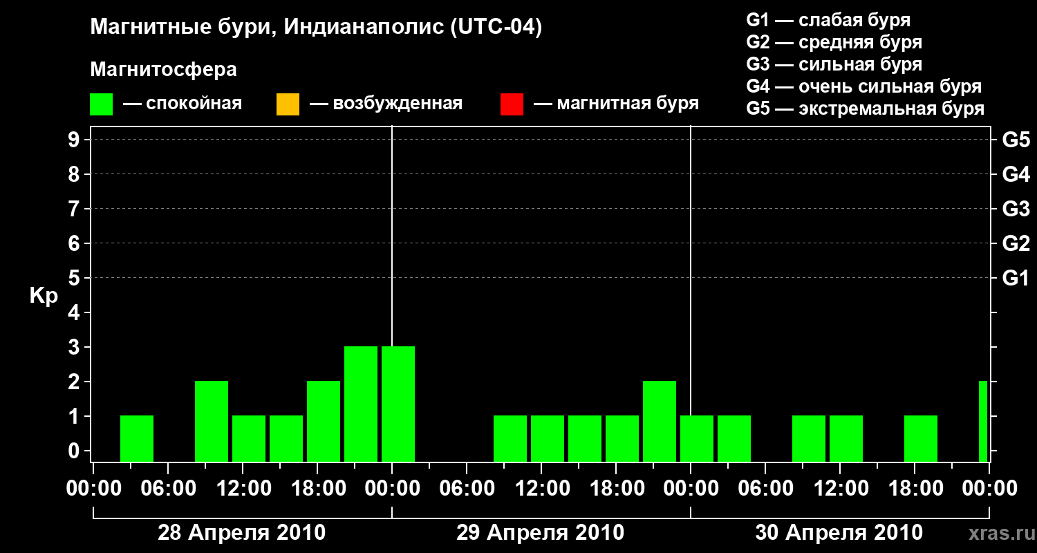 Изменения геомагнитного индекса Kp с 28 по 30 апреля 2010 года для средних широт