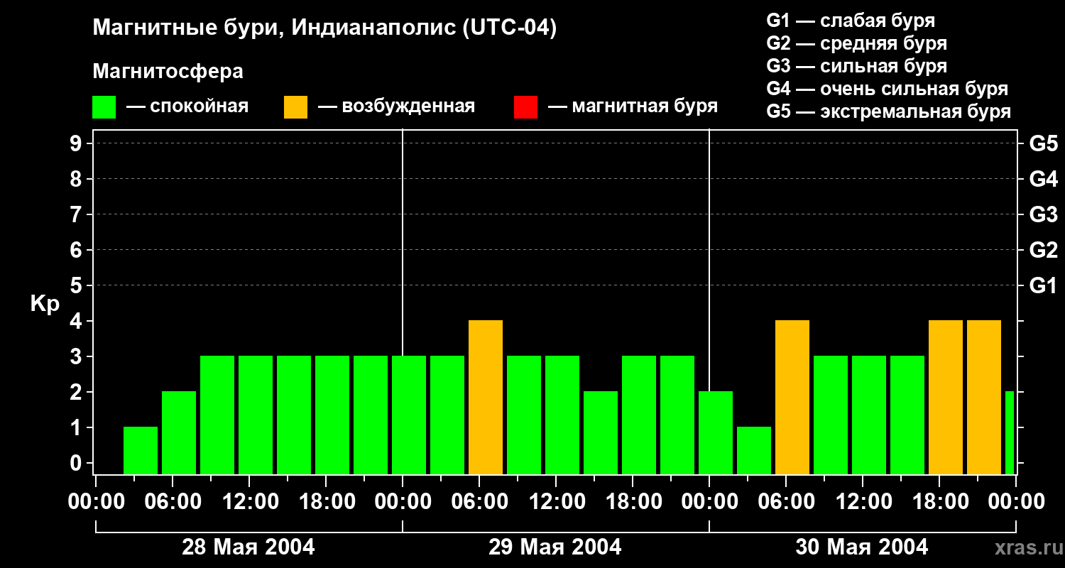 Изменения геомагнитного индекса Kp с 28 по 30 мая 2004 года для средних широт