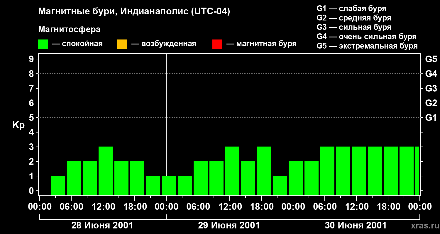 Изменения геомагнитного индекса Kp с 28 по 30 июня 2001 года для средних широт