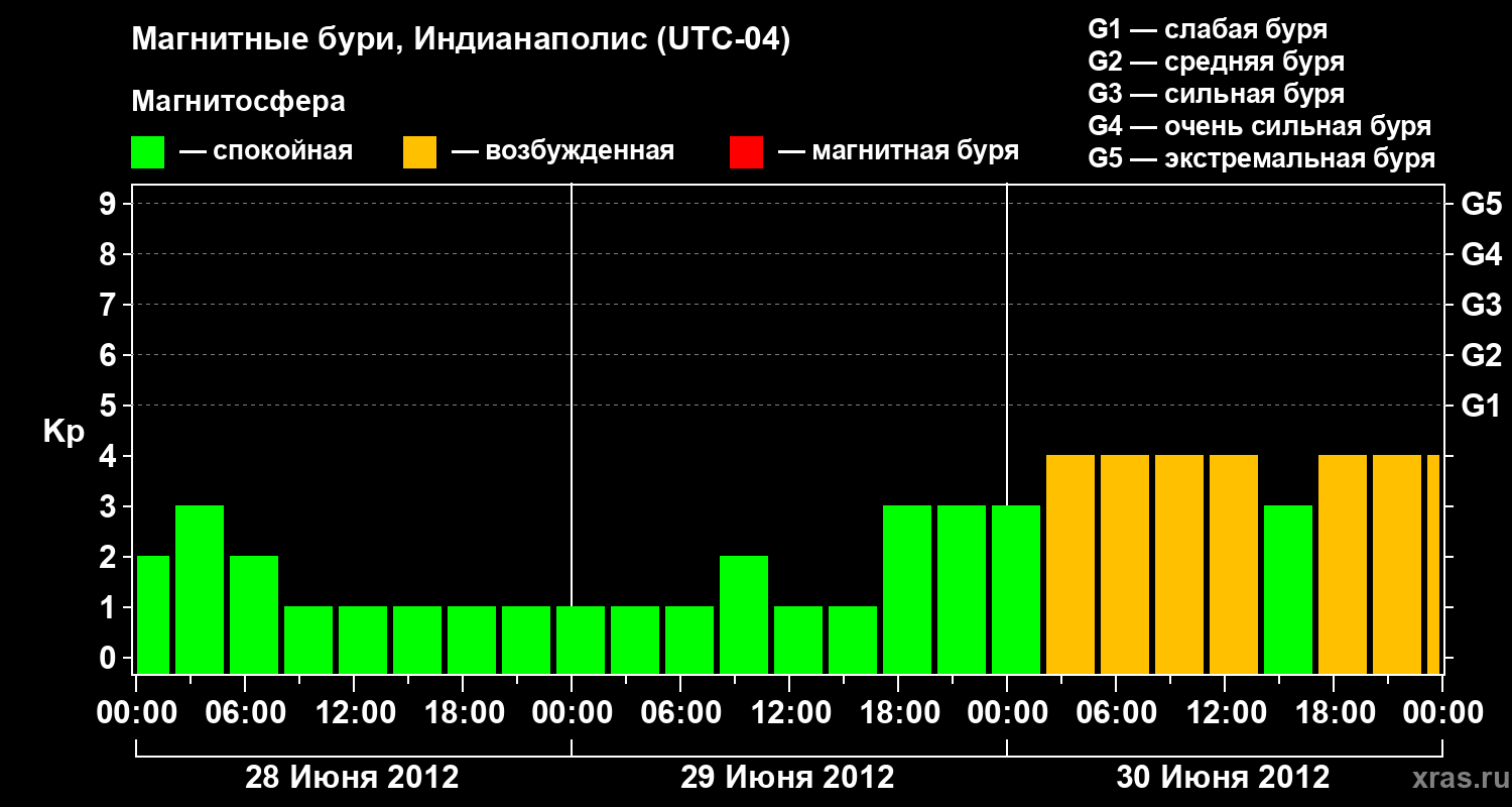Изменения геомагнитного индекса Kp с 28 по 30 июня 2012 года для средних широт