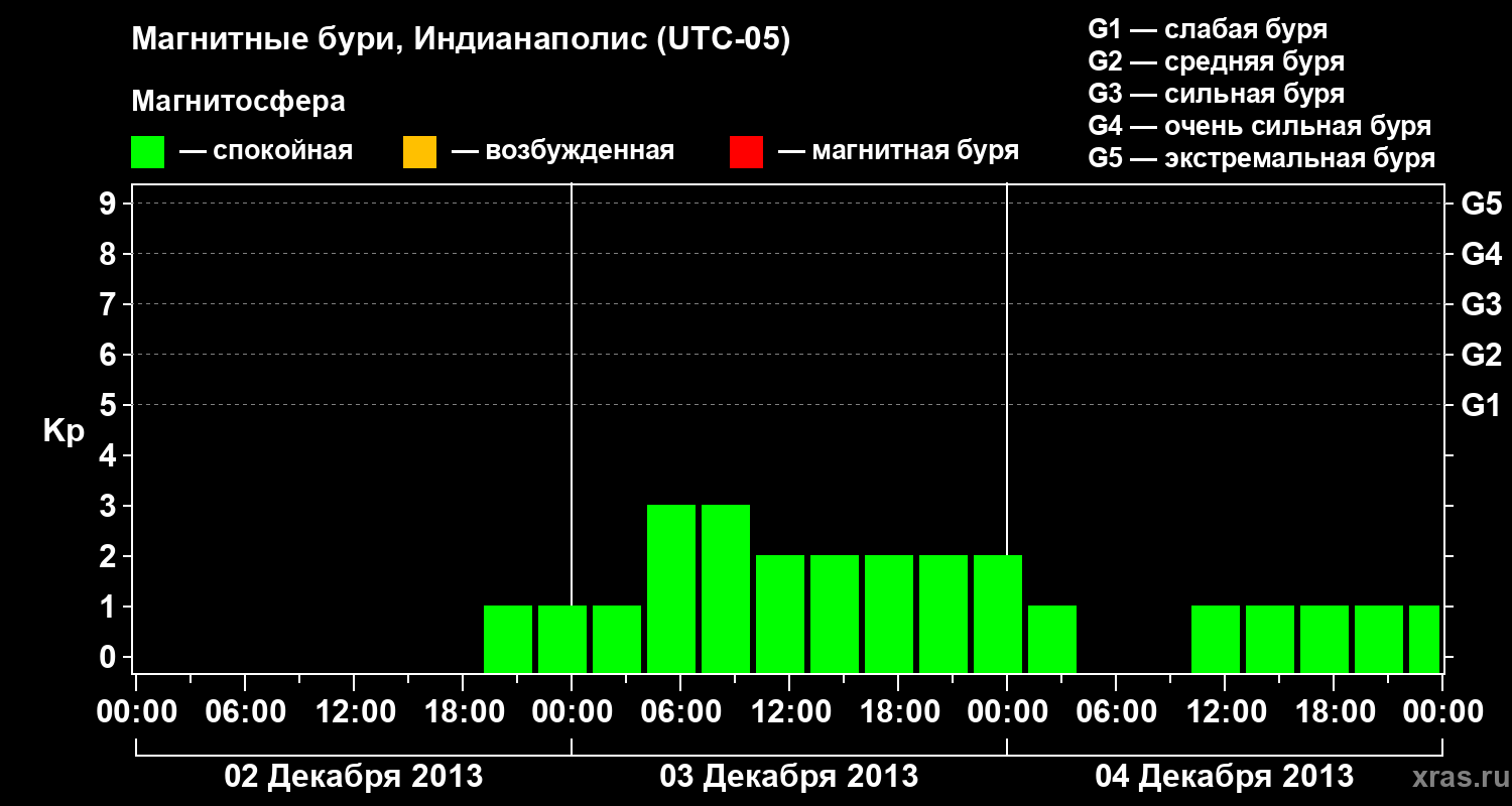 Изменения геомагнитного индекса Kp с 2 по 4 декабря 2013 года для средних широт