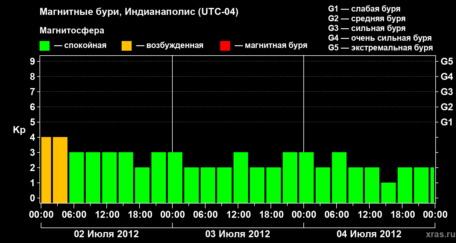 Изменения геомагнитного индекса Kp с 2 по 4 июля 2012 года для средних широт
