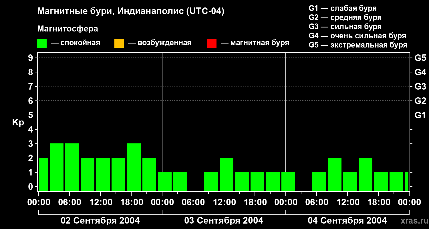 Изменения геомагнитного индекса Kp с 2 по 4 сентября 2004 года для средних широт